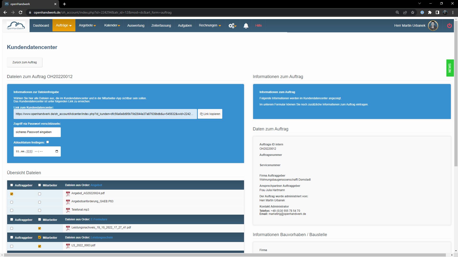 Unbezahlbar wird die Lösung im Mehrwert, wenn Sie auf einmal Dokumente finden, die Sie vielleicht im Vorfeld nicht gefunden haben und diese Ihren Umsatz sichern. Jetzt reden wir von Prozessen! In openHandwerk gehören alle Dokumente, Bilder und Formulare in Angebots- oder Auftragsakten, um Ihren Auftrag fachgerecht ausführen zu können, um Ihre Arbeit zu dokumentieren und Ihre Rechnung abzusichern, um ihr Risiko zu minimieren und zu lernen, wie man den Auftrag nächstes Mal besser abwickeln könnte. Und das Schöne daran ist – Sie können das Dokumentencenter nach Ihren Freigaben und Wünschen mit Dritten teilen – offen, befristet in der Laufzeit oder mit einem Passwort!