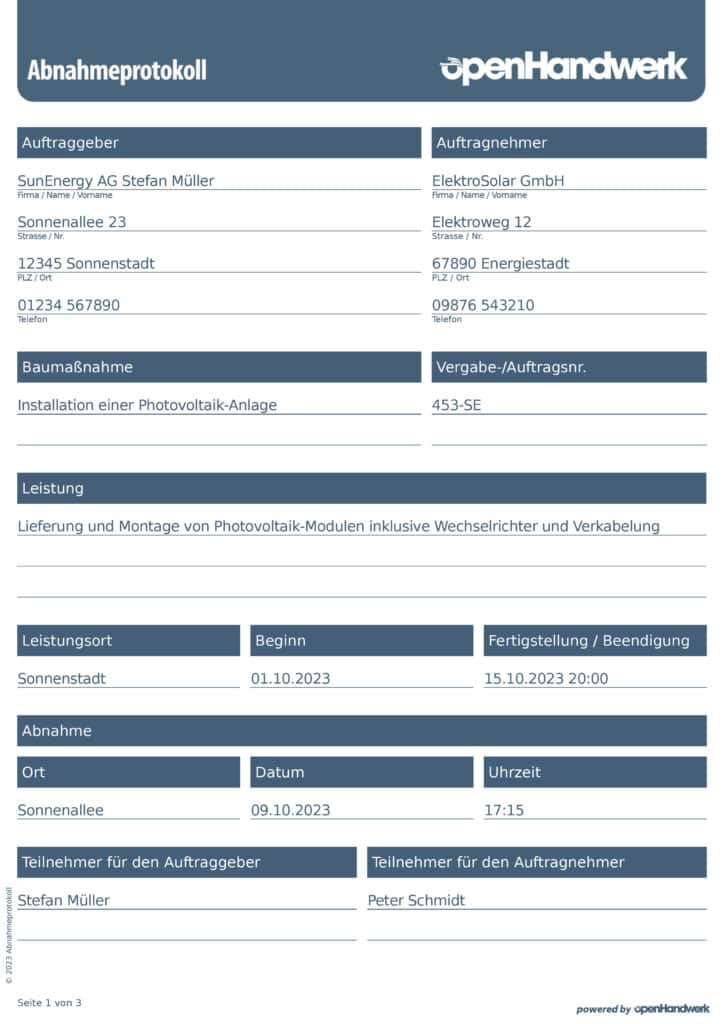 Wer schreibt, der bleibt! Mit openHandwerk füllen Sie Formulare aus und erhalten E-Signaturen. E-Signaturen können die Freigabe vom Auftraggeber, die Abnahme, die Unterschrift vom Bauleiter, Hausmeister oder Mieter sein – oder die Bestätigung durch Ihren Mitarbeiter oder Nachunternehmer.