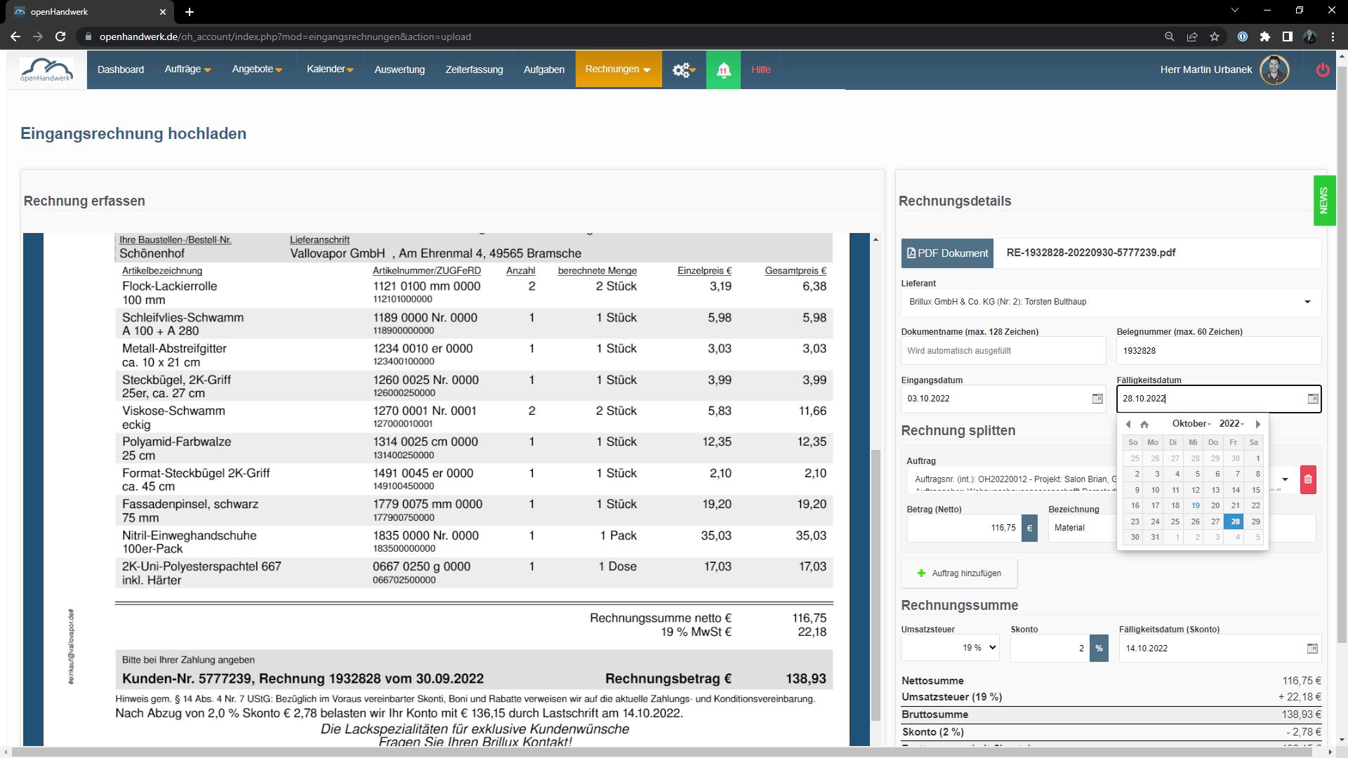 Eingangsrechnungen sind ein wesentlicher Bestandteil Ihrer Kalkulation. Handwerksbetriebe laden Ihre Eingangsrechnungen in openHandwerk hoch und buchen diese auf Projekte. Sie können dabei Belege direkt auf Angebots- und Auftragsmappen buchen oder die Eingangsrechnung auch auf mehrere Baustellen und/ oder Projekte splitten. Mit openHandwerk erhalten Sie somit einen Überblick über Ihre Eingangs-Buchhaltung.
