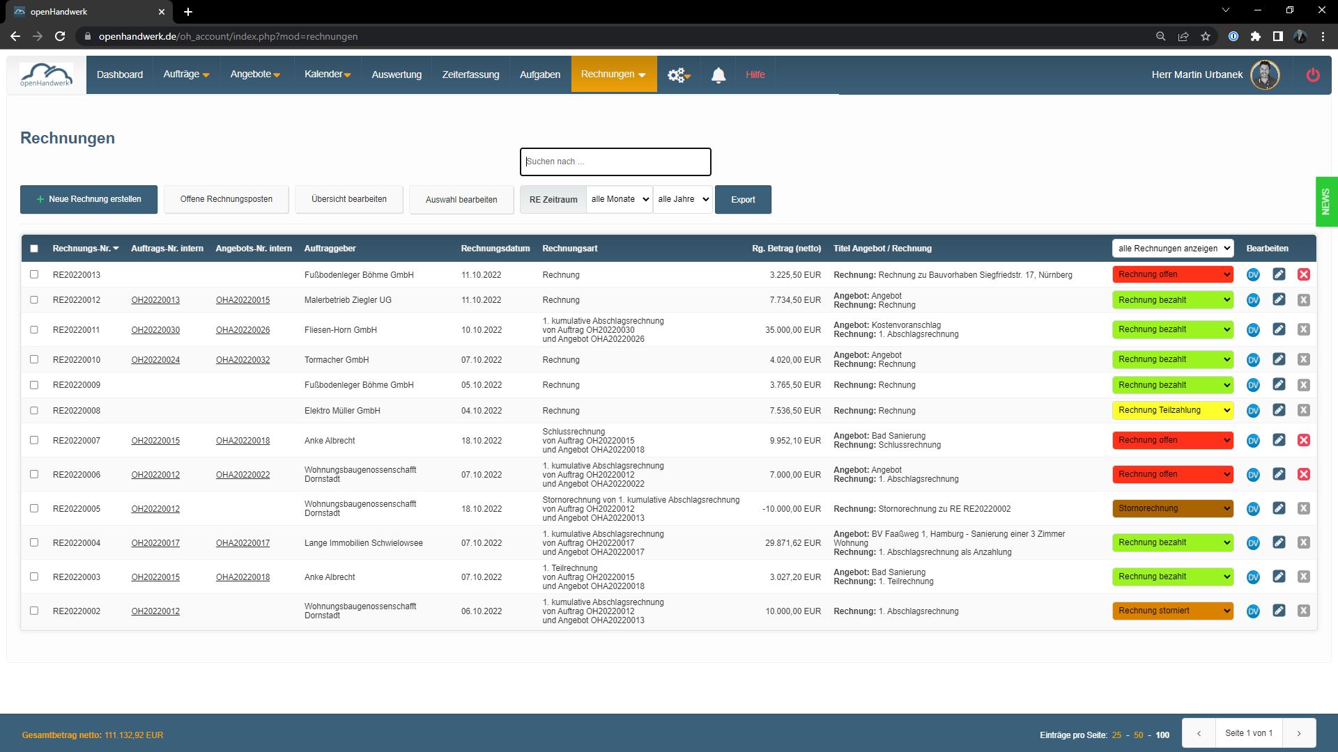 Angebote und Rechnungen waren nie so einfach. Ob Abschlagsrechnung, kumulative Teilrechnungen, Sicherheitseinbehalte, Baustrom und/ oder Skonto. Handwerksbetriebe und Bauunternehmen haben ein anspruchsvolles Rechnungswesen. openHandwerk bietet hier den größten Umfang im Bereich von Cloudsoftware. Durch unseren gewerkeübergreifenden Ansatz haben wir eine Vielzahl von Funktionen in unserer Handwerkersoftware umgesetzt.