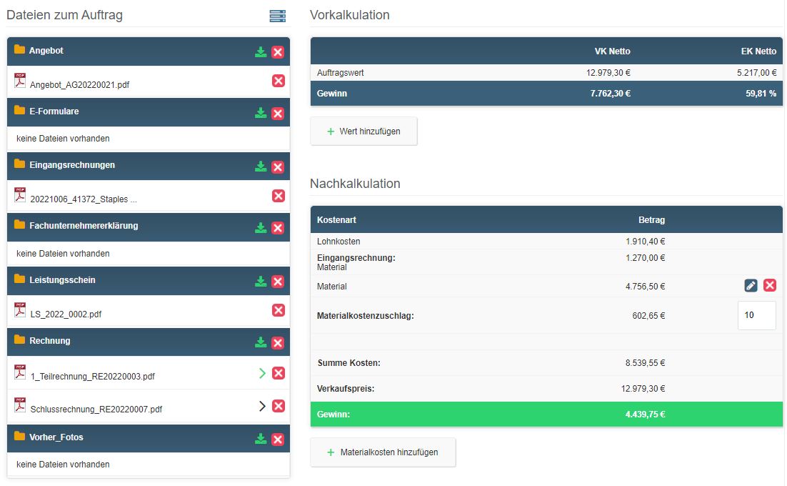 Material & Arbeitszeit verursachen Kosten und sind ausschlaggebend für eine gute Nachkalkulation. Bei openHandwerk lieben unsere Kunden unsere Nachkalkulation. Material kann auf Projekte verteilt werden. Mitarbeiter erfassen Ihre Zeiten mit individuellen Stundensätzen, Ihre Zeiten auf Ihre Projekte – Sie haben somit einen Überblick in Echtzeit und sehen sofort Abweichungen zu Ihrer Vorkalkulation. Verringern Sie Ihr unternehmerisches Risiko mit uns.