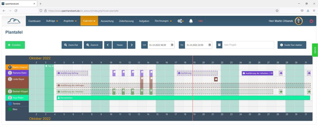 Generalunternehmer in openHandwerk planen mit unserem Kalender und unserer Plantafel. Besonders im Bereich der Plantafel haben Sie zahlreiche Möglichkeiten, Kolonnen, Maschinen, Fahrzeuge und Nachunternehmer zu planen und per Drag & Drop zu verschieben.