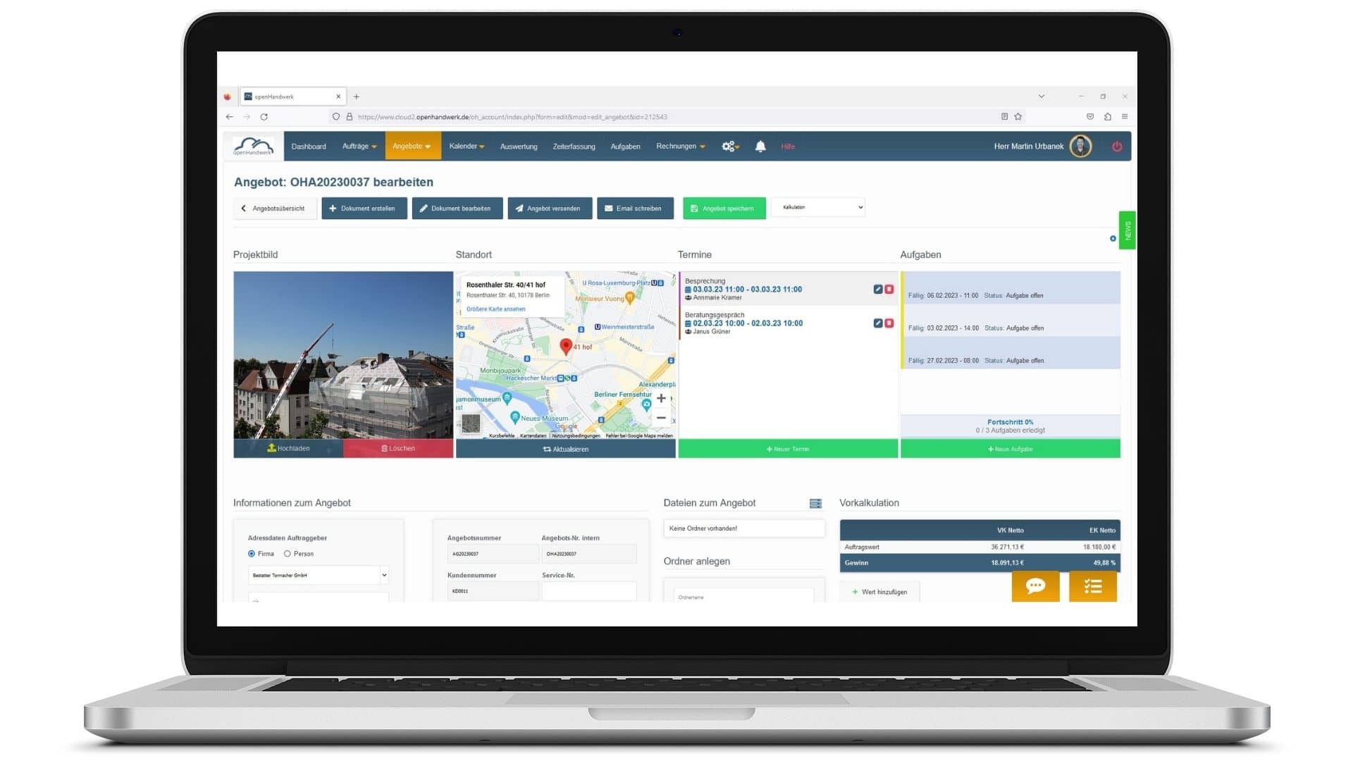 Das Angebot ob als PDF digital oder per Post an den möglichen neuen Kunden ist die erste Visitenkarte. Die Informationen müssen richtig, kalkuliert und nachvollziehbar aufgeschlüsselt sein – dazu ist das Angebot da. In der Cloudsoftware openHandwerk ist das Angebot der Startpunkt für viele weitere Dokumente und Berechnungen. Daher widmen wir uns hier eine Einheit lang nur dem Angebot.