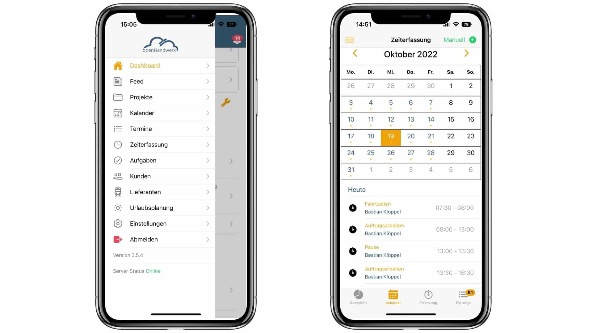 Mit der openHandwerk App ist die Cloud direkt in der Hosentasche. Hier wird Zeit erfasst, navigiert, telefoniert und die Baustelle dokumentiert und wichtige Dokumente sind jederzeit auch offline verfügbar.